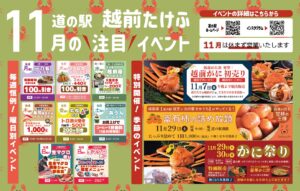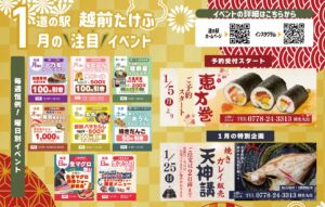 道の駅 越前たけふは、北陸新幹線の新駅「越前たけふ駅」に隣接した施設です。「福井」と言えば「海鮮が美味しい!」とイメージされる方が多く、地元鮮魚店が運営する当道の駅では、日帰りで美味しいかにが楽しめます。交流広場(道の駅敷地内)では道の駅で買った鮮魚やお肉・産直野菜をその場でBBQすることができます。また車中泊などにもご利用いただけます。